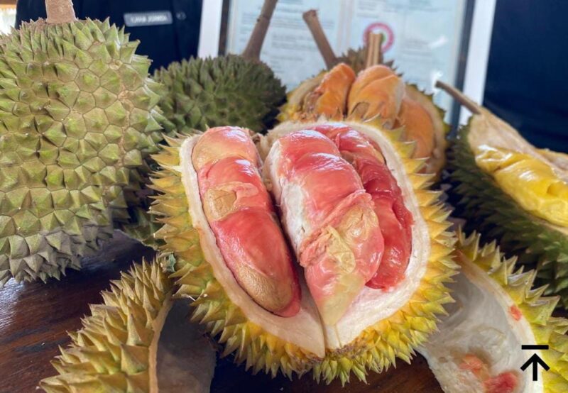 Plt. Kepala Dinas Pertanian dan Pangan Banyuwangi, Ilham Juanda, menjelaskan durian merah memiliki warna daging merah, merah pelangi, atau merah semburat, aroma khas, rasa manis-pahit seimbang, tekstur lembut, dan kandungan gizi tinggi. Durian ini berasal dari 6 varietas unggul nasional: Balqis, SOJ, Gandrung, Sayu Wiwit, Tawangalun, dan Madu Blambangan.